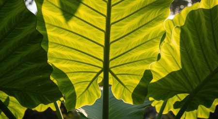 bright green tropical leaves with sunlight shining through, highlighting bold veins and natural abstract patterns in lush foliage.