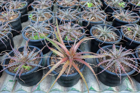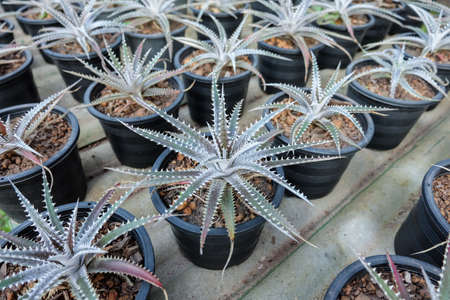 Aloe Vera Chinensis plants on pots in an interior with their typical cactus leaves. Aloe Vera Chinensis is a species of succulents growing in warm places.