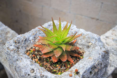 Aloe arborescens. tiny succulents or cactus in desert botanical garden and stone pebbles background