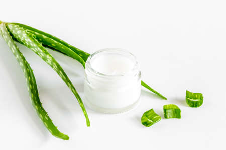 Natural herbal skin care products on white background. Aloe vera products. Top view