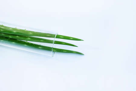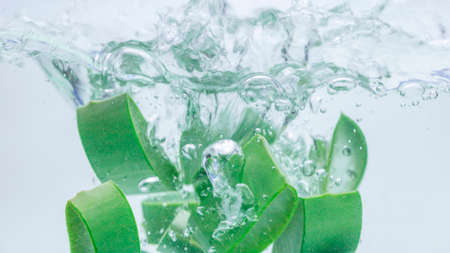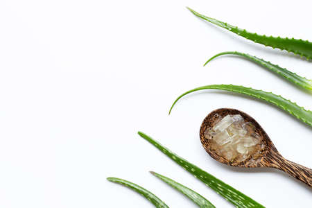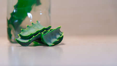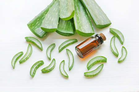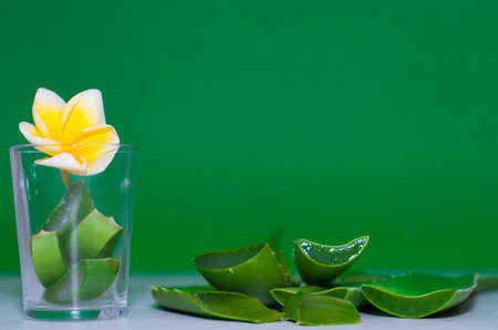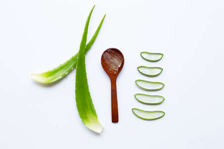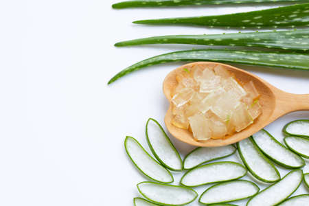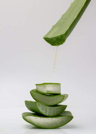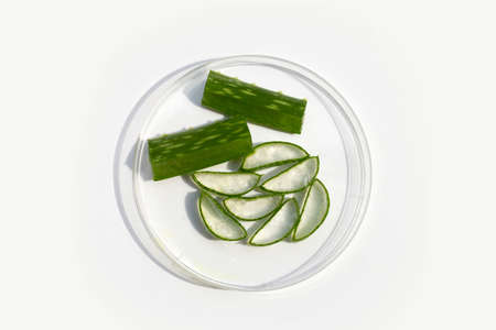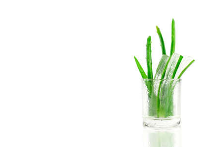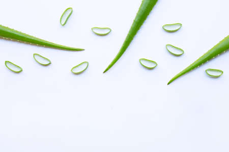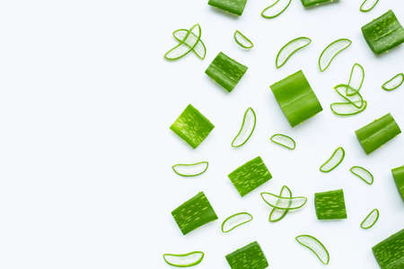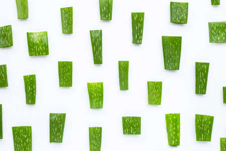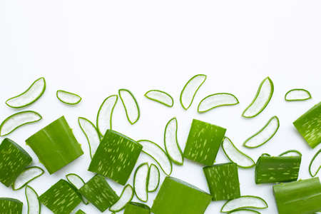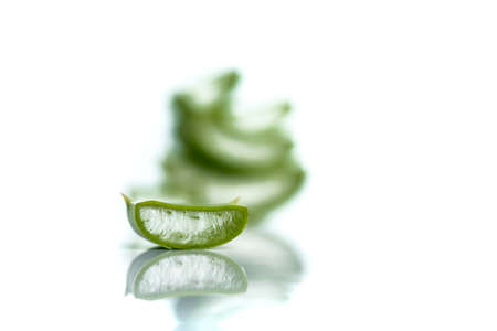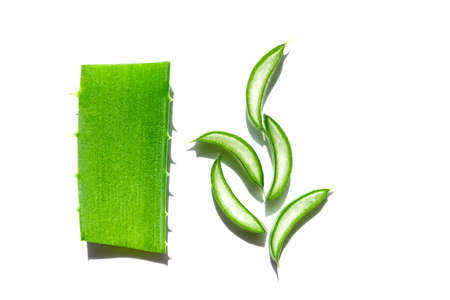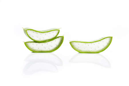 Slices of Aloe Vera leaves on a white background. Aloe Vera is a very useful herbal medicine for skincare and hair care.