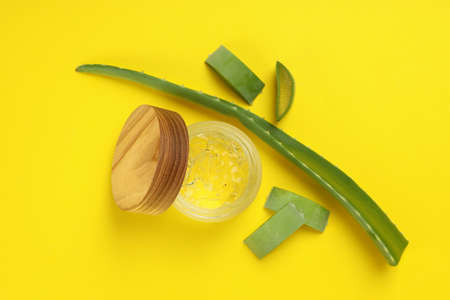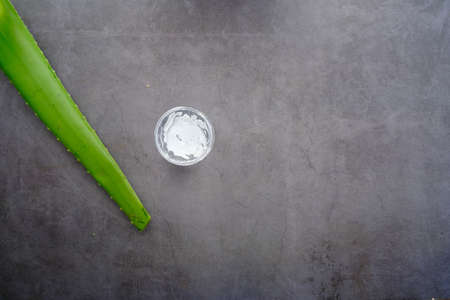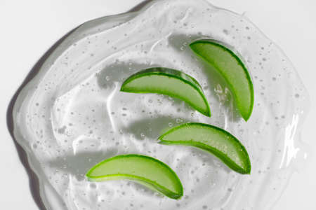 Gel with sliced slices of juicy aloe vera. Facial serum, skin care. Top view, copy space