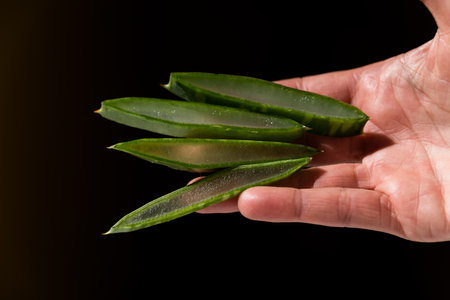 Fresh aloe vera sliced and liquid gel in plastic container on black background