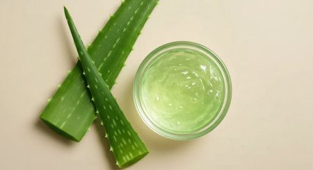 Green aloe vera gel next to natural ingredients for cosmetics. Face and skin care.