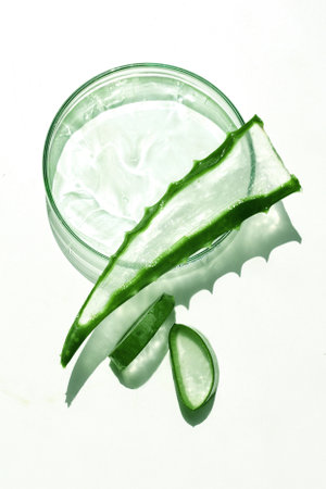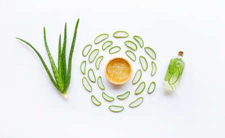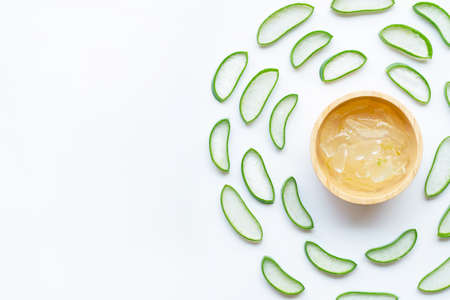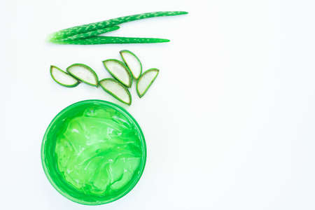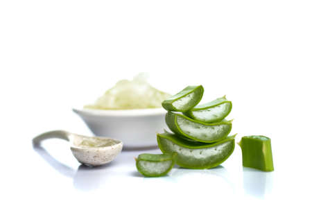 Slices of Aloe Vera leave and Aloe Vera gel in a bowl on a white background. Aloe Vera is a very useful herbal medicine for skin care and hair care.