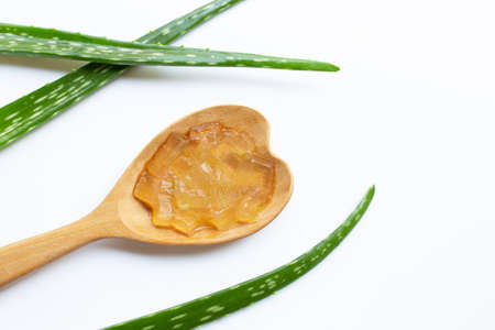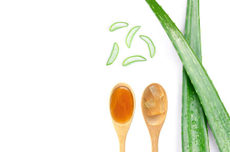 Green fresh aloe vera leaves ,aloevera gel and honey in wooden spoon isolated on white background. Natural herbal medical plant ,skin care ,health and beauty spa concept. Overhead view . Flat lay.