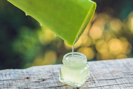 Fresh aloe vera plant, stem slices and gel in glass jar on wooden background, skin therapy, natural organic cosmetic concept.