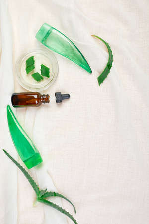 Flat lay of homemade skin care natural ingredients plant aloe vera gel, skinimalism, slow beauty on cloth texture background , copy space.
