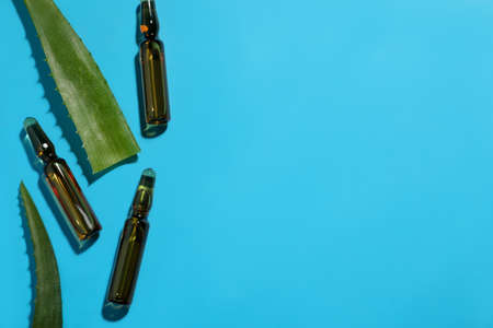 Pharmaceutical ampoules with medication and aloe leaves on light blue background, flat lay. Space for text