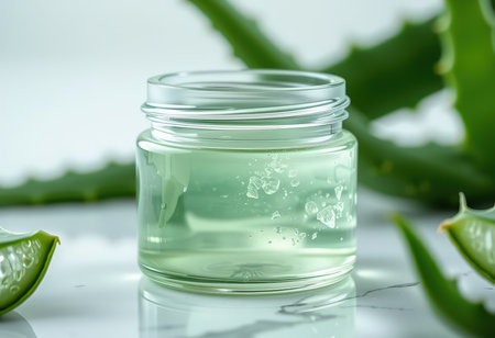 Aloe vera gel in a jar surrounded by fresh aloe leaves on a white surface