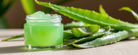 A jar of green aloe vera gel with fresh aloe leaves on wooden surface, showcasing natural skincare and soothing hydration benefits