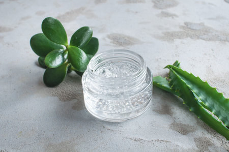 Gel texture with bubbles hyaluronic acid and aloe vera branches in a glass jar on a concrete background