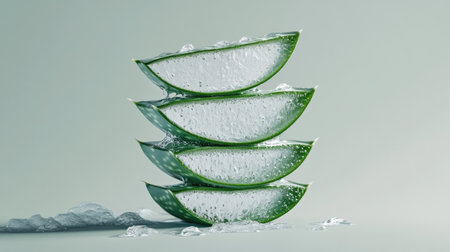 A stack of freshly cut aloe vera slices with glistening gel, set against a neutral background, highlighting the plant's health benefits.