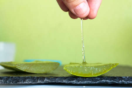 Aloe vera gel dripping from the leaf on the stacked aloe vera.