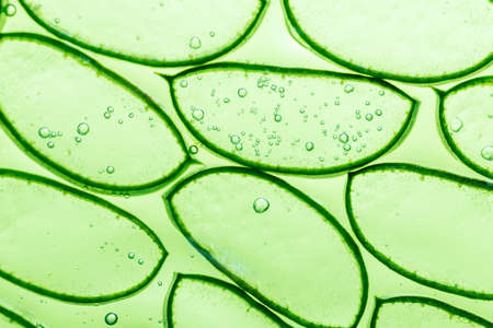 Aloe vera slice texture with gel on green background. Medicinal plant. Flat lay. Top view. Natural herbal medical plant, skincare, healthcare and beauty spa concept.