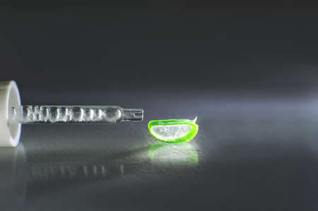 Pipette and aloe vera in serum gel with oxygen bubbles close up. Close up of dropper for cosmetics with empty space.