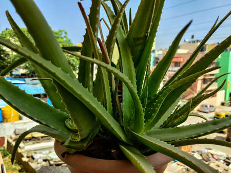 Stock photo of aloe vera plant in brown color plastic pot kept in the balcony, blur residential area on background. Picture captured under bright sunlight at Bangalore, Karnataka, India.