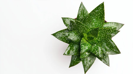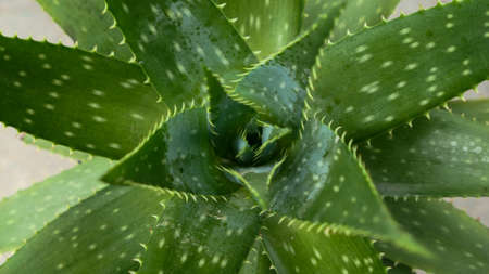 An overhead shot reveals an aloe vera plant, showcasing its green leaves adorned with water droplets. The image highlights a close-up perspective and a soft focus, emphasizing the texture and details of the plant. This shot suggests a natural setting, possibly in a garden or indoor environment, ideal for various commercial or editorial applications.