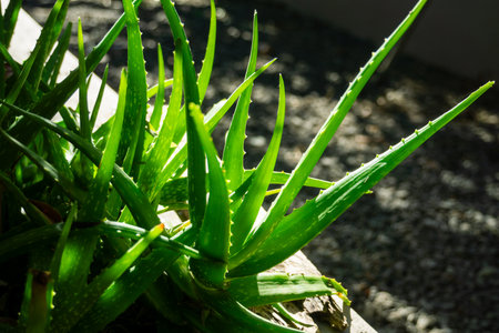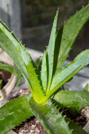 Aloe vera plant in sunlight in the backyard.