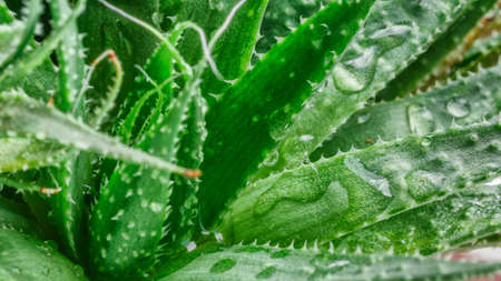 Aloe Vera closeup Water drops on leaf of aloe. Aloevera plant, natural organic renewal cosmetics, alternative medicine. Skin care concept, moisturizing. On green background.