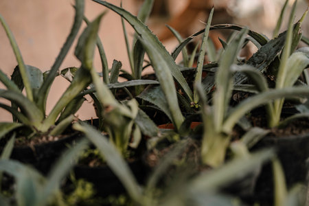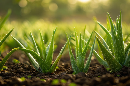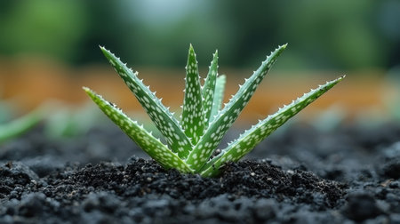 vibrant aloe vera seedling thrives in nutrient rich soil, showcasing its thick, fleshy leaves and strong roots setting highlights importance of medicinal plants in agriculture