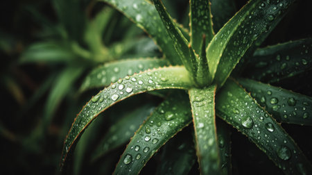 Closeup of aloe tropical plant leaves with rain drops. Green natural backdrop. Generative AI.