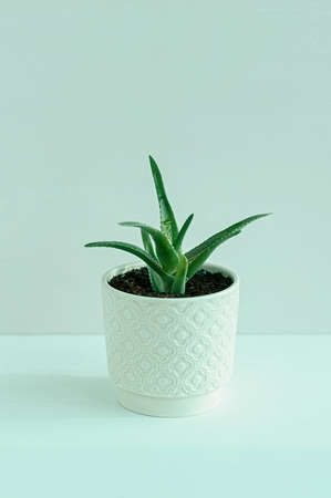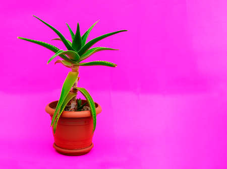 Aloe plant in a pink ceramic flower pot on the light background. Planting and care of indoor plants and flowers. Close up.