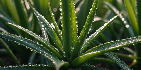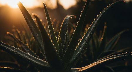 Aloe vera plant with dew drops on the leaves at sunset