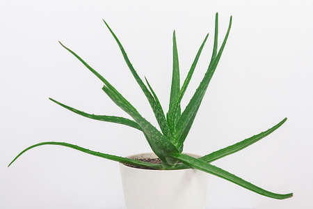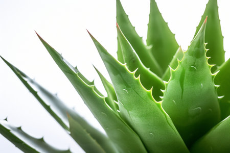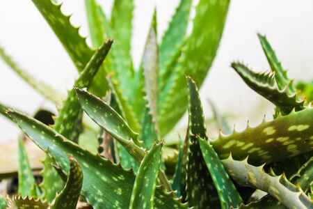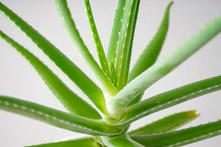 Aloe vera is a popular medicinal plant for health and beauty, on a white background. Useful herbal medicine for skin care and hair care used as treatment, smoothie. Close up of green leaves.