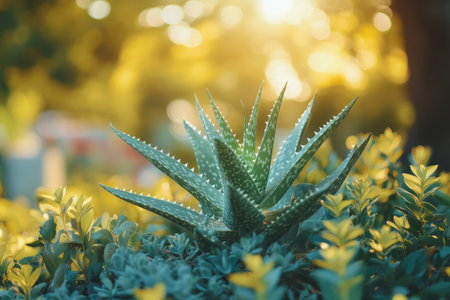 Close up of an aloe vera plant growing in a garden with beautiful golden light at sunset