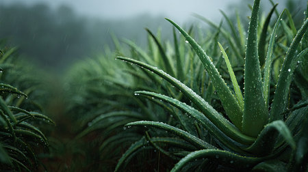 A panoramic wide view of Aloe vera field growing closely together under light drizzle soft raindrops on leaves ultra realistic photography natural daylight cinematic wide composition lifelike natural scene