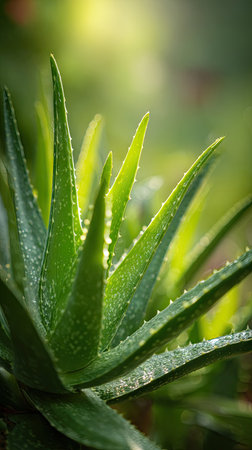 AI Generated. Close up of vibrant aloe vera leaves with dew drops for freshness and green vibrancy