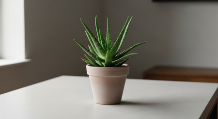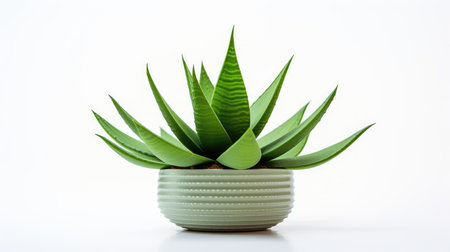 Bright and vibrant aloe vera plants display elegance on a stone base against a soft white background, perfect for minimalist decor and wellness concepts in modern settings.
