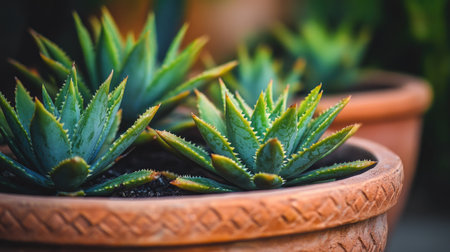 Some kind of Snake plant in terracotta pots for garden decoration.