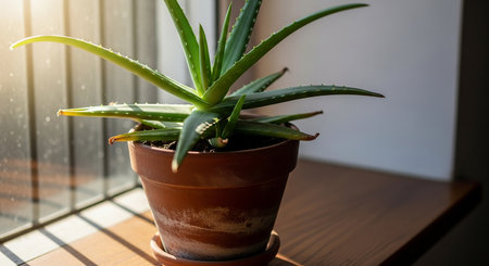 Aloe vera plant in a pot on the windowsill.