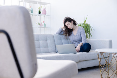 Young woman has doubts at home sitting on her sofa with a laptop in modern apartment with hands in her hair