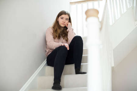 Fed Up Teenage Girl Sitting On Stairs At Home