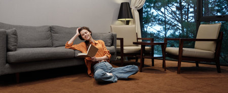 Happy serene woman sitting on the floor and reading a book, she is smiling and browsing pages
