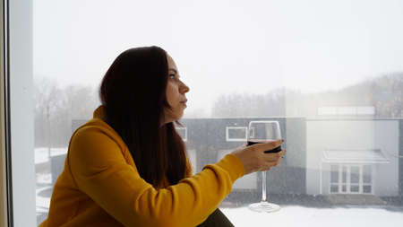 Relaxed young woman drinks red wine, sitting on windowsill. Adult brunette with alcohol looks out window on snowy weather and thinks about something