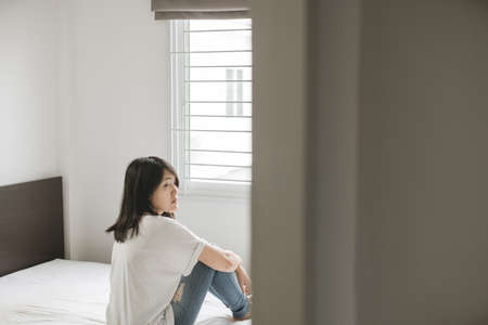 girl in stress at home - dramatic portrait of young sad and depressed Asian Korean woman on window feeling worried and desperate during covid19 stay home and lockdown