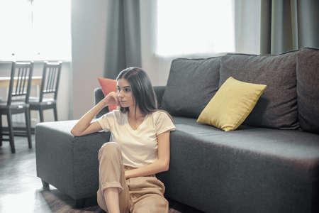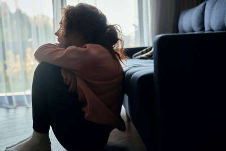 Depressed young caucasian woman flooring in silence next to sofa