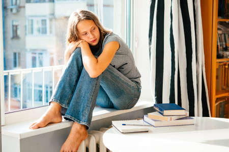 A sad teenage girl sits on window sill instead of reading books on the table