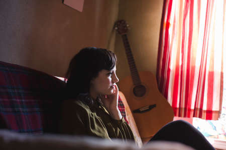 Young woman sitting on sofa, guitar in background