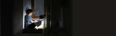 banner. Boy wearing a santa claus hat writes a letter asking for a gift for christmas in a dark room