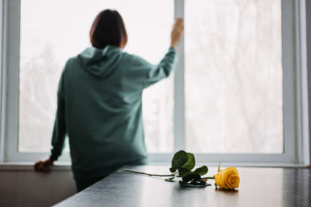 Mental health, loneliness, depression, Anger, Anxiety, Bipolar disorder and panic attacks concept. Back view of unhappy sad alone young woman with yellow rose flower at home