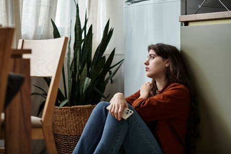 A woman seated on the floor near a plant, lost in thought while grappling with her feelings.