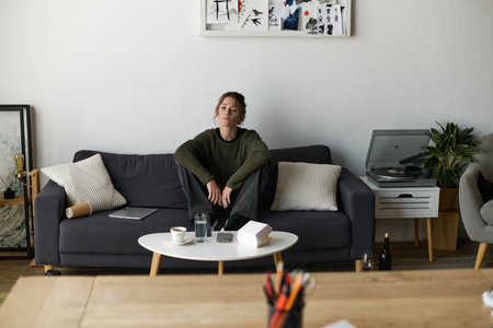 A young woman sits on a couch in her living room, surrounded by a quiet, reflective atmosphere.
