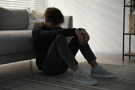 Depressed teenage boy near sofa at home