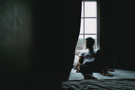 Lonely single man sit and rest alone in dark bedroom with light from curtain.