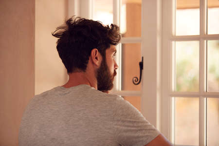 dramatic portrait of attractive sad and depressed mid adult man looking through home window feeling worried and desperate suffering depression problem thoughtful in pain